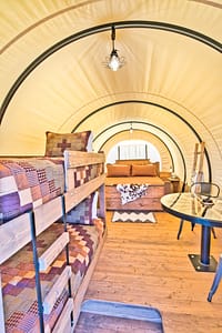 Experience Glamping at its best in the Wild, Wild West! Stay in one of our western-themed Conestoga Wagons, like a modern-day westward pioneer. These rustic and luxurious Wagons are so unique and are beyond anything you’ve ever experienced. All Wagons are made of wood with canvas tops and come furnished with a King bed and one bunk bed; can sleep up to 4 total.